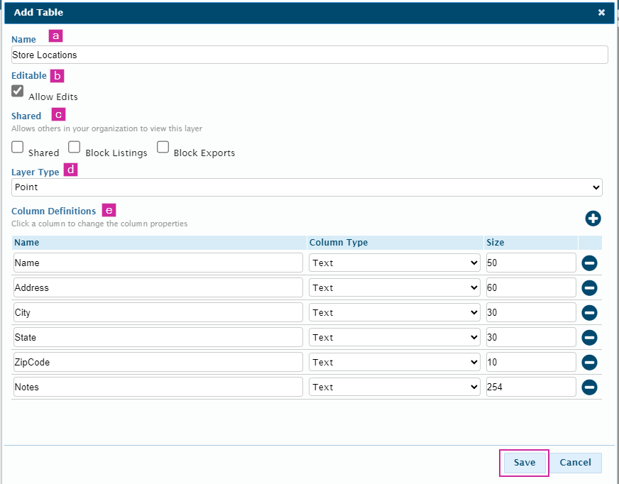Note: To create a table that contains shapes, such as a trade area table – choose “polygon”. - You can define the fields you want to see in your table under “Column Definitions”. In each column, you can set the name, data type and maximum column character length/size.