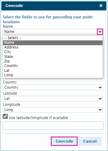 - If your data does not have reliable geographic coordinates, use the dropdowns to select the appropriate fields for Address, City, Zip/Postal Code, State/Province, Country and uncheck the use latitude/longitude if available checkbox.