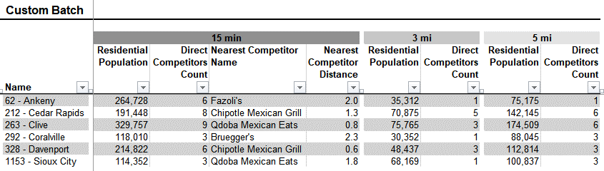 A custom batch is a standard report used to capture information for multiple sites. A batch report utilizes an existing input table or file and assigns a search area to the input locations. The search areas then gather information by custom variables, such as demographics, selected by the user for each site in the original input table or file.