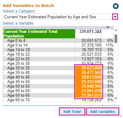 - If you want to group multiple variables and sum them (Age 35-65, for example), hold the SHIFT key on your keyboard and select all the variables you want to sum together