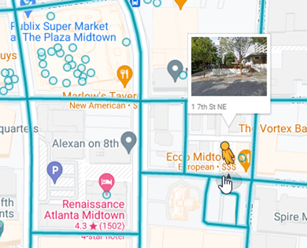 - The screen will change from the map to Google Street view. You can move and view areas of interest by clicking around just as you would in Google Maps.