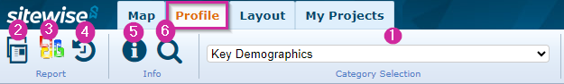 Once you're in the Profile tab, the top menu bar will change to show options that help you view the demographics of an area of interest.