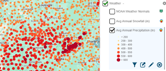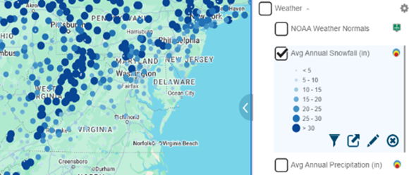 In Sitewise, NOAA Weather Normals offers monthly temperature (F°) averages, minimums, and maximums along with the annual average temperature and the average number of days by temperature. In terms of precipitation, the point layer offers annual precipitation and snowfall (in). Locational data like latitude, longitude, elevation and state are also available.