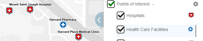 - Hospitals: this is a more filtered version of the Healthcare layer listed above, showing hospitals only.