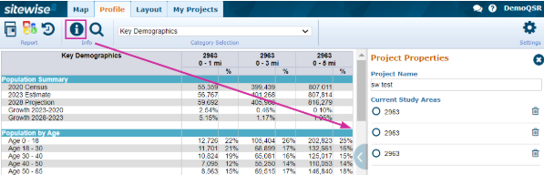 The study area tools in Sitewise provide additional functionality that helps you get the most out of your study areas. The Profile tab contains many tools allowing you to generate reports, edit projects, and view demographics which are discussed in the