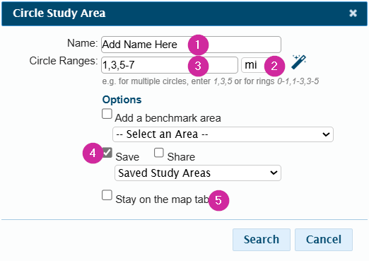 - You can create multiple study areas of the same type by entering several numbers delimited by commas. For example: 1,3,5-mile rings can all be made at once.