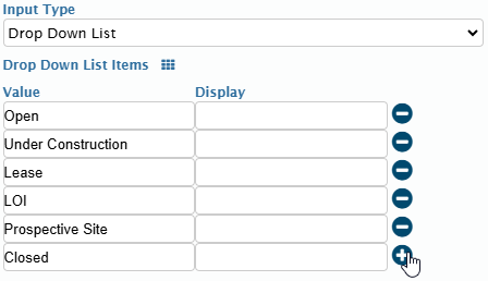 icon and add the new value. - If the Display value will not be different from the value, you can leave this blank. If the Display value will be different, for example Prospective Site will now be Prospective Location, add the Display value "Prospective Location" and that status option will now appear when users use the dropdown.