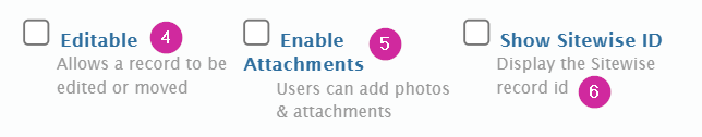 - Enable Attachments: This option allows you to attach documents to records in Sitewise (such as PDFs, photos, etc.).