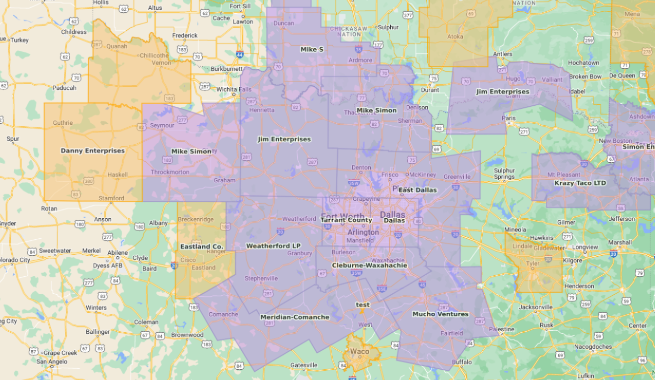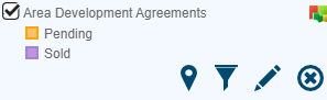Polygons refer to data based on regions that can be referenced from a predefined geographical boundary (I.e., State, DMA) or free form. Like point layers, polygons can be styled on one all-encompassing region or from specific statuses. For example, the Area Development Agreements layer is styling on the two Pending and Sold statuses to visually depict what stage the polygon region is undergoing.