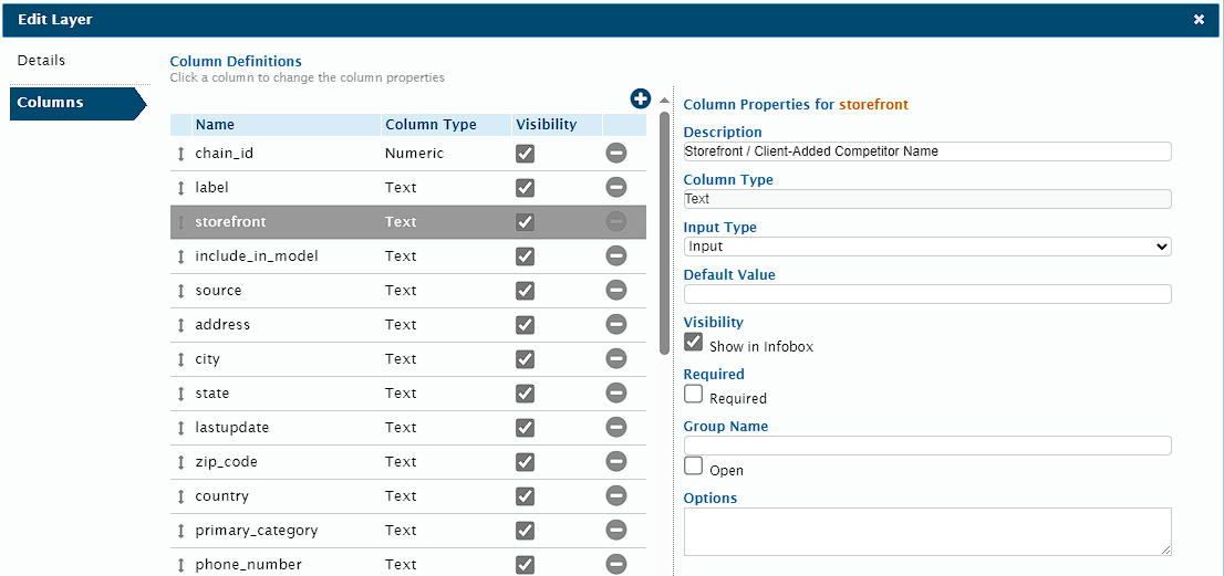 The column tab allows you to edit your individual attribute settings and reflect on how it displays when toggling the layer settings in the main Sitewise map. You can update and modify settings such as the ‘Description’, ‘Input Type’ and Visibility.