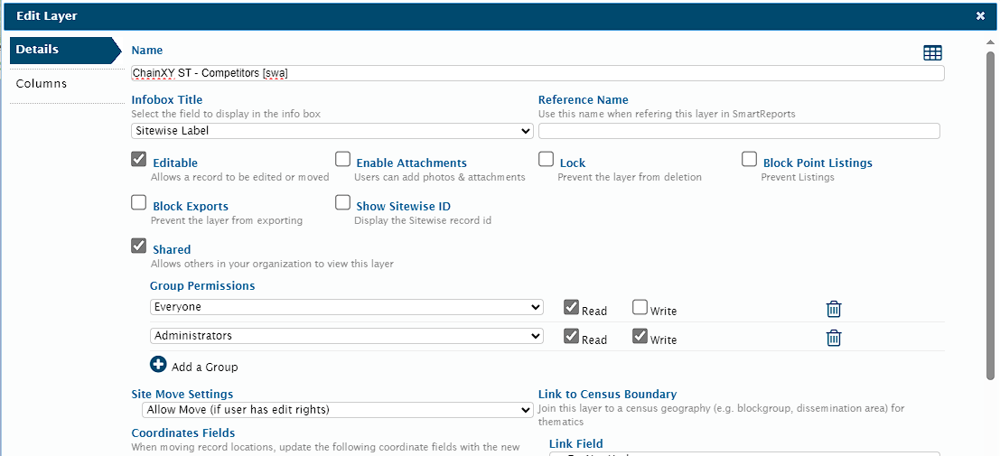 Tables can let you edit permissions, add/remove attributes and update existing settings. The interface below within the Details tab is where you can edit your table settings. Some features include editing Shared Group Permissions, Site Move Settings and Linking the records to a Census Boundary. Overall, these settings help with the functionality and display of the layer in a Sitewise map.