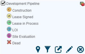 Point data refers to a specific point on a map depicted through a Latitude and Longitude coordinate. Point layers can be styled on one all-encompassing icon or specific statuses for a more granular view. For example, the Development Pipeline layer is styling on different statuses to visually depict where the location is at with their pipeline development stage.
