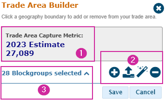 The Trade Area Builder tool is used to create and save Polygon Study Areas, composed of pre-defined geographic units. Pre-defined geographic units are boundaries such as Block Groups, ZIP Codes, Census Tracts, and Metropolitan Statistical Areas.