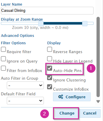 - Once clicked, the editing panel will open on the right and you will want to scroll to the bottom and select Auto-Hide Pins (1) and then click change (2).