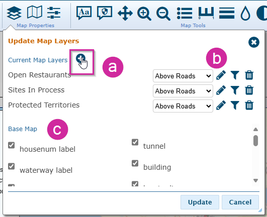- Once in the Update Map Layers tool, you can add and edit layers, as well as alter the contents of the basemap.