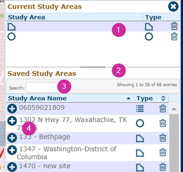 - The bottom of the panel allows you to quickly add other study areas that have previously been saved to the map.