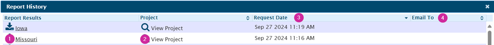 View previously run reports and download them using this tool. On the pop up, the name of the report, the date it was created, and the email address it was sent to (if any) will appear.