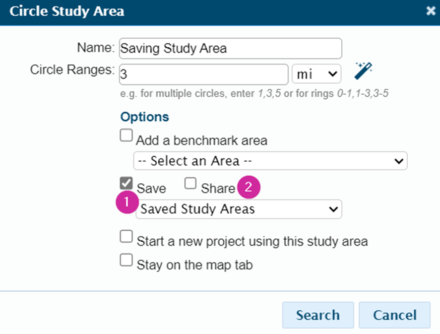 - All study areas added to Saved Study Areas will be accessible by all users in the account, making it easy to share. This also means that it is important to give any saved study areas a recognizable name so it is easy to find.